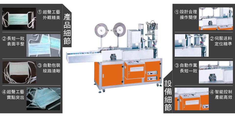 “鴻達牌”口罩綁帶包裝機,是利瀚企業熟練掌握口罩生產工藝后, 根據客戶要求, 在國內研發成功且國外市場買點特別突出的全自動口罩綁帶包裝機,本機自動化程度高,主體采用優質鋁合金材料,外觀精美。面板采用硬化處理,PLC微電腦控制,自動張力控制系統,運行更加穩定。特殊的制作工藝確保在綁帶口罩包裝時,邊角紋路清晰、均勻、效率高。