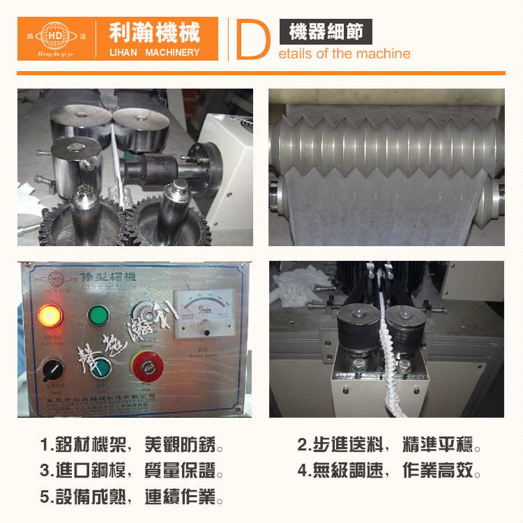 產(chǎn)品裝備及特色:本機為全主動頭帽(條形)專用機器,從進(jìn)料、鬆緊帶進(jìn)料、折疊、熔合、堵截皆為主動化,制品搜集文本操控。操作簡易,歡迎來鞋套樣品訂貨機器。機器特性: