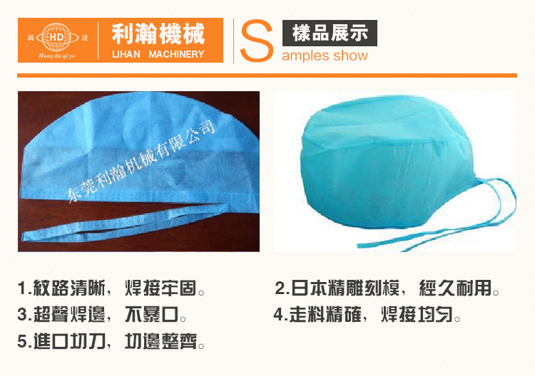 全主動超聲波制帽機,是利瀚企業(yè) 全主動制帽設(shè)備,運用超聲波技能將不織布經(jīng)過機電一體化主動操控,制作成醫(yī)用手術(shù)帽、廚師帽等產(chǎn)品;本機主動化程度較高,一人克操作多臺設(shè)備,功率可達(dá)60---90cps/min。可生產(chǎn)18、19、21及24寸頭套